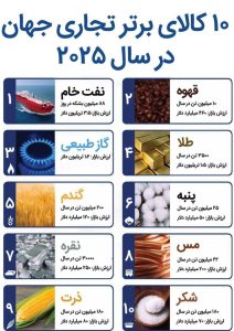 طلا: با وجود تولید سالانه نسبتاً کم (حدود ۲۰۰۰ تن)، ارزشی برابر با ۱.۵ تریلیون دلار را به خود اختصاص داده و به نمادی از امنیت سرمایهگذاری در بحرانهای جهانی بدل شده است.