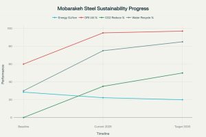 نمودار پیشرفت پایداری فولاد مبارکه نشان میدهد این شرکت در مسیر توسعه سبز و بهرهور گامهای قابلتوجهی برداشته است. مصرف انرژی به ازای هر تن فولاد طی سالهای اخیر روندی کاهشی داشته و نشاندهنده ارتقای بهرهوری انرژی است. سهم استفاده از آهن اسفنجی بهعنوان ماده اولیه اصلی تا سال ۲۰۳۰ به مرز ۱۰۰ درصد میرسد که بیانگر حرکت بهسوی زنجیره تولید کمکربن است.