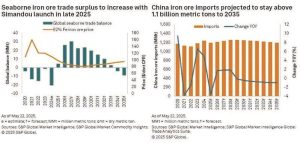 تحلیلگران بازار پیشبینی میکنند که قیمت سنگآهن بهتدریج کاهش خواهد یافت و تا سال ۲۰۳۰ به حدود ۸۰ تا ۸۳ دلار در هر تن برسد. همانطور که در شکل شماره ۱ (نمودار سمت چپ) نشان داده شده است، این کاهش قیمت عمدتاً به دلیل افزایش مازاد عرضه در تجارت جهانی سنگآهن از طریق دریاست که انتظار میرود با راهاندازی پروژه سیماندو در اواخر سال ۲۰۲۵ تشدید شود. بااینحال، نمودار همچنین نشان میدهد که قیمتها پس از رسیدن به کف در حدود سال ۲۰۲۹، با انقباض مجدد توازن بازار، ممکن است تا سال ۲۰۳۵ بهبود یابند. عواملی مانند رسیدن تولید فولاد چین به نقطه اشباع و رشد بازیافت فولاد، نیاز به مواد خام را کاهش خواهند داد، اگرچه انتظار میرود تولید فولاد هند به رشد خود ادامه دهد.
