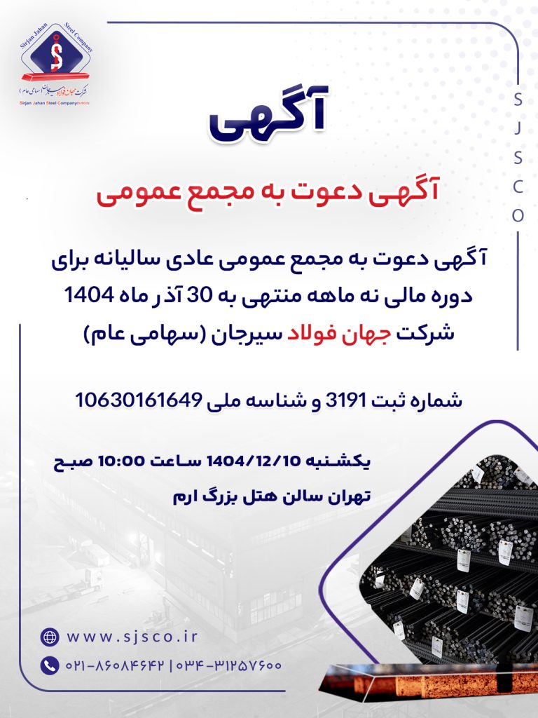 مجمع عمومی عادی سالیانه شرکت جهان فولاد سیرجان برای دوره مالی نه ماهه منتهی به ۳۰ آذر ماه ۱۴۰۴ در تاریخ ۱۰ اسفند ۱۴۰۴ برگزار می شود.