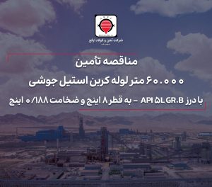 فراخوان مناقصه تأمین ۶۰٬۰۰۰ متر لوله کربن استیل جوشی درز API 5L GR.B با قطر ۸ اینچ و ضخامت ۰/۱۸۸ اینچ جهت شرکت آهن و فولاد ارفع…